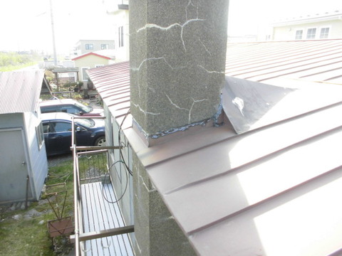施工前は、煙突の付け根に補修した跡があり