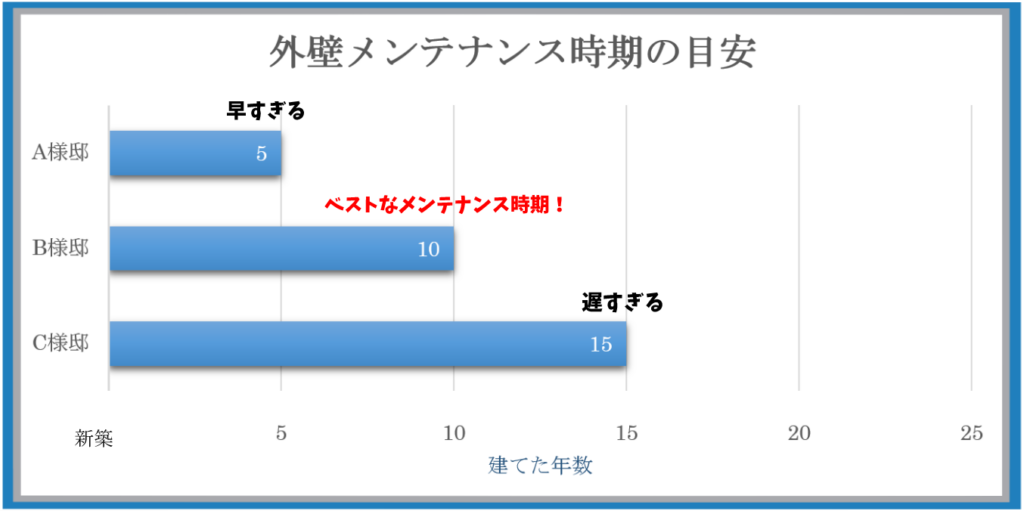 ※あくまで新築から10年です。2度目の塗り替えからは塗り替え時になんの塗料を何回塗ったかで変わってきます。